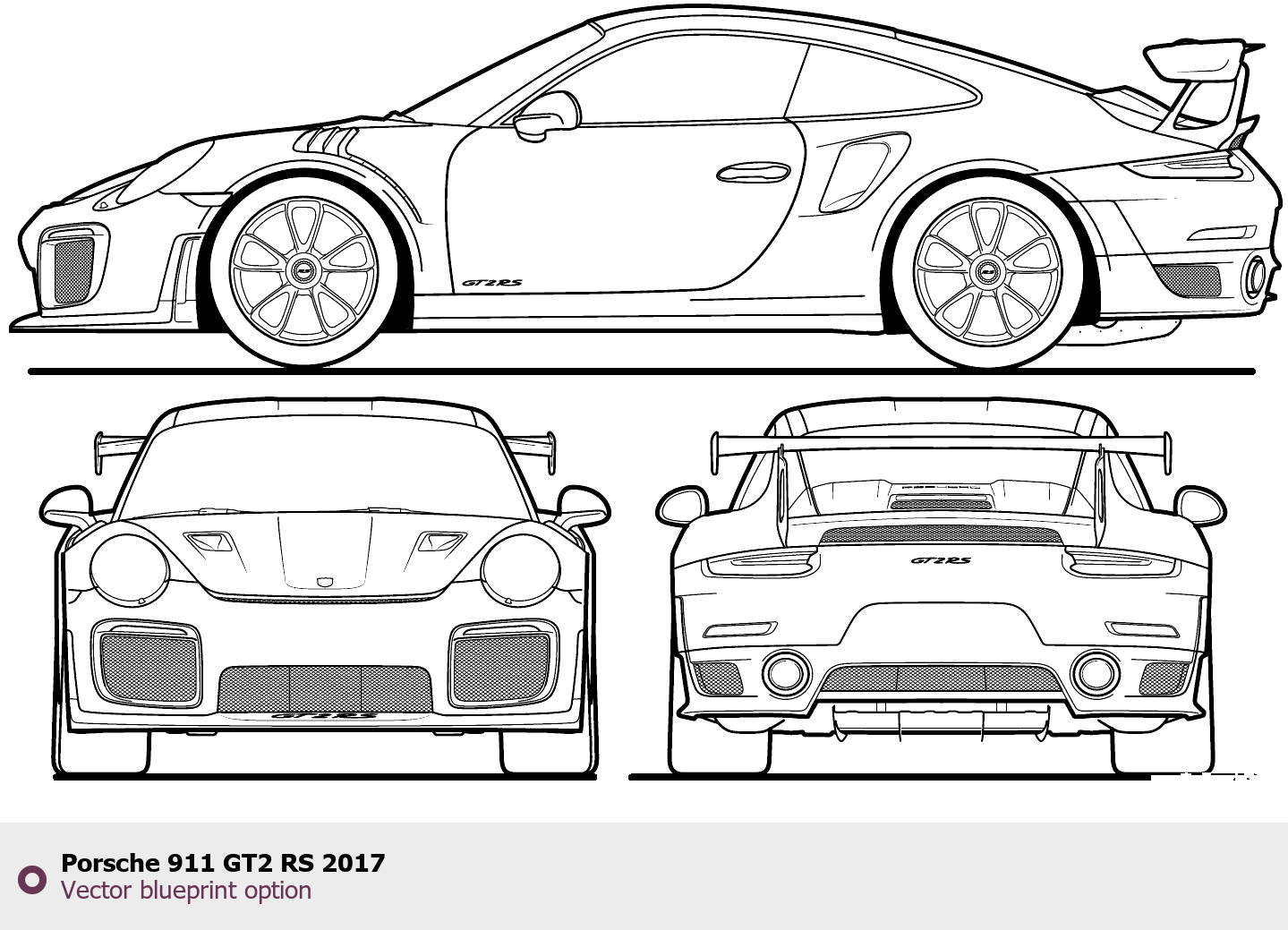 Raster blueprint of the 2017 Porsche 911 GT2 RS Tag. This free downloadable image can be used for graphic projects, digital design, and 3D modeling. The file provides accurate exterior proportions of the vehicle. Model year: 2017. Body type: Tag.