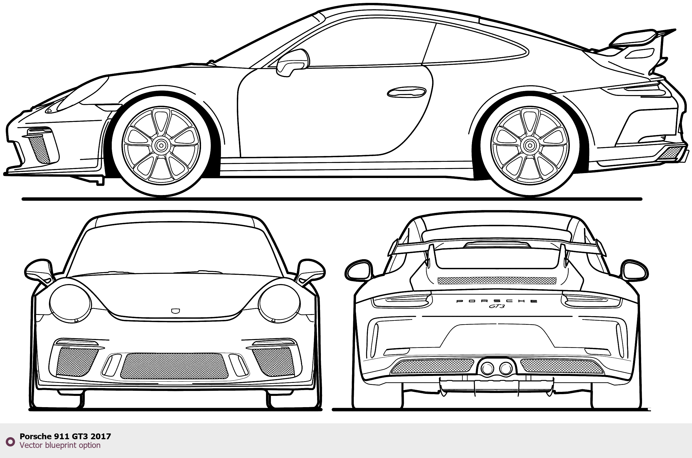 Raster blueprint of the 2017 Porsche 911 GT3 Tag. This free downloadable image can be used for graphic projects, digital design, and 3D modeling. The file provides accurate exterior proportions of the vehicle. Model year: 2017. Body type: Tag.
