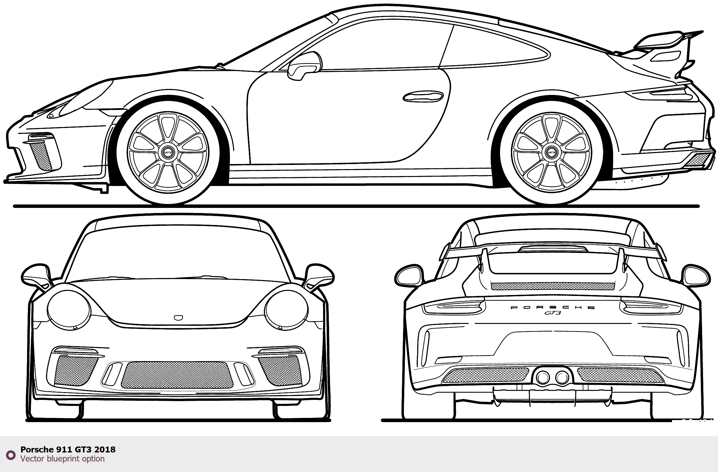 Raster blueprint of the 2018 Porsche 911 GT3 Tag. This free downloadable image can be used for graphic projects, digital design, and 3D modeling. The file provides accurate exterior proportions of the vehicle. Model year: 2018. Body type: Tag.