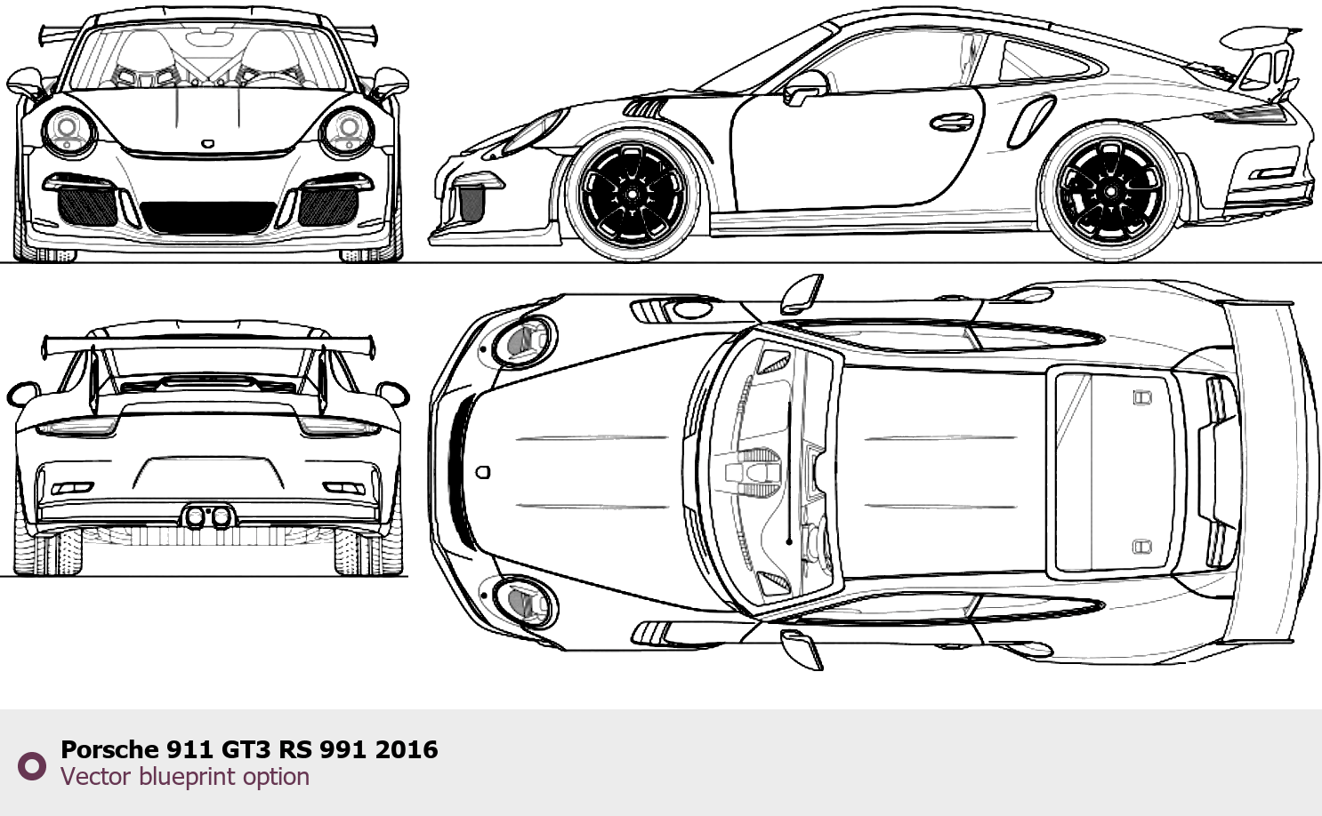 Raster blueprint of the 2016 Porsche 911 GT3 RS 991 Tag. This free downloadable image can be used for graphic projects, digital design, and 3D modeling. The file provides accurate exterior proportions of the vehicle. Model year: 2016. Body type: Tag.