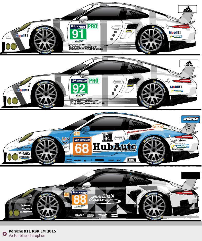 Raster blueprint of the 2015 Porsche 911 RSR LM Tag. This free downloadable image can be used for graphic projects, digital design, and 3D modeling. The file provides accurate exterior proportions of the vehicle. Model year: 2015. Body type: Tag.