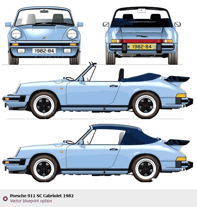 Raster blueprint of the 1982 Porsche 911 SC Cabriolet Cabriolet. This free downloadable image can be used for graphic projects, digital design, and 3D modeling. The file provides accurate exterior proportions of the vehicle. Model year: 1982. Body type: Cabriolet.