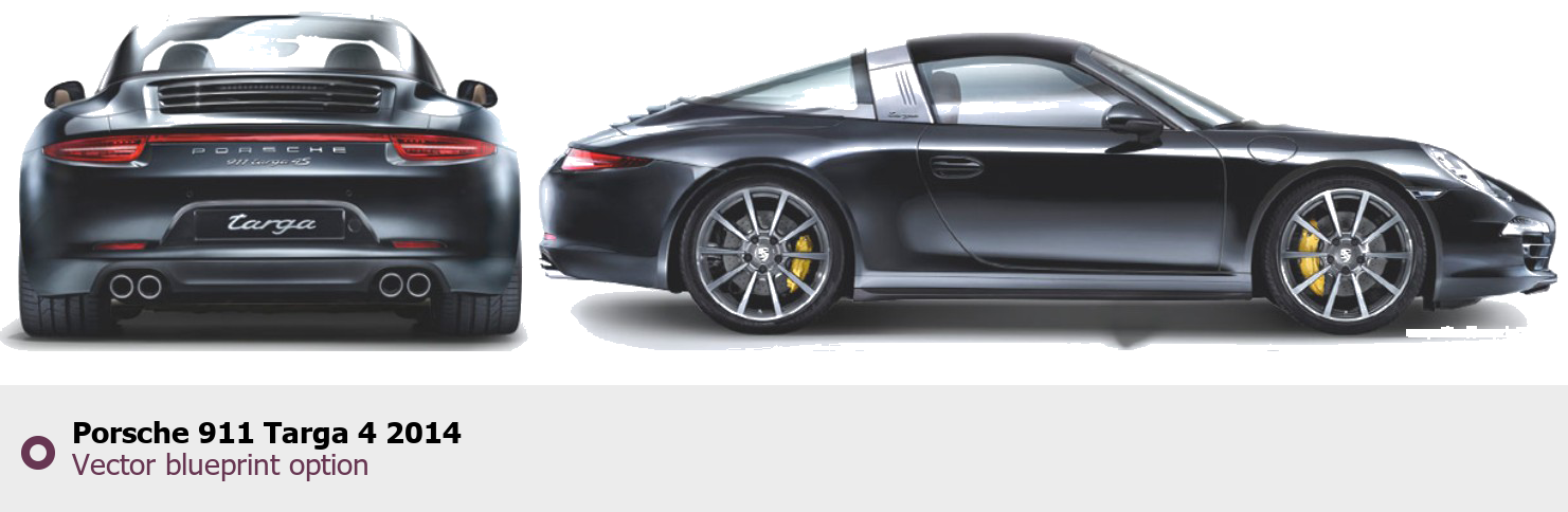 Raster blueprint of the 2014 Porsche 911 Targa 4 Targa. This free downloadable image can be used for graphic projects, digital design, and 3D modeling. The file provides accurate exterior proportions of the vehicle. Model year: 2014. Body type: Targa.