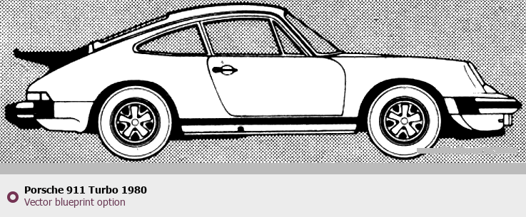 Raster blueprint of the 1980 Porsche 911 Turbo Coupe. This free downloadable image can be used for graphic projects, digital design, and 3D modeling. The file provides accurate exterior proportions of the vehicle. Model year: 1980. Body type: Coupe.