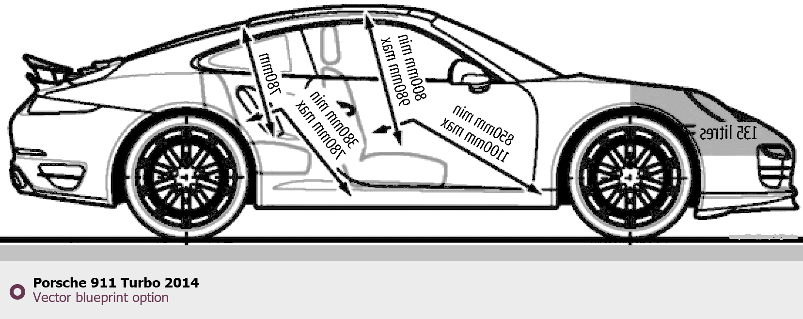 Raster blueprint of the 2014 Porsche 911 Turbo Coupe. This free downloadable image can be used for graphic projects, digital design, and 3D modeling. The file provides accurate exterior proportions of the vehicle. Model year: 2014. Body type: Coupe.