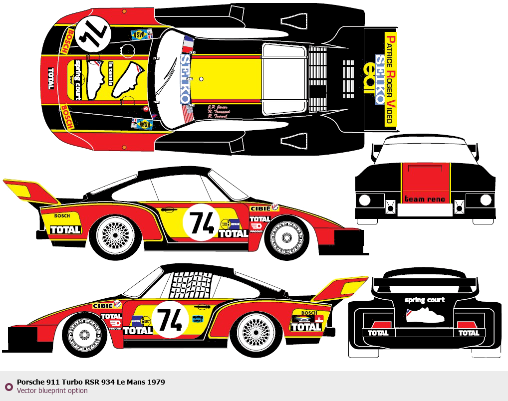 Raster blueprint of the 1979 Porsche 911 Turbo RSR 934 Le Mans Coupe. This free downloadable image can be used for graphic projects, digital design, and 3D modeling. The file provides accurate exterior proportions of the vehicle. Model year: 1979. Body type: Coupe.
