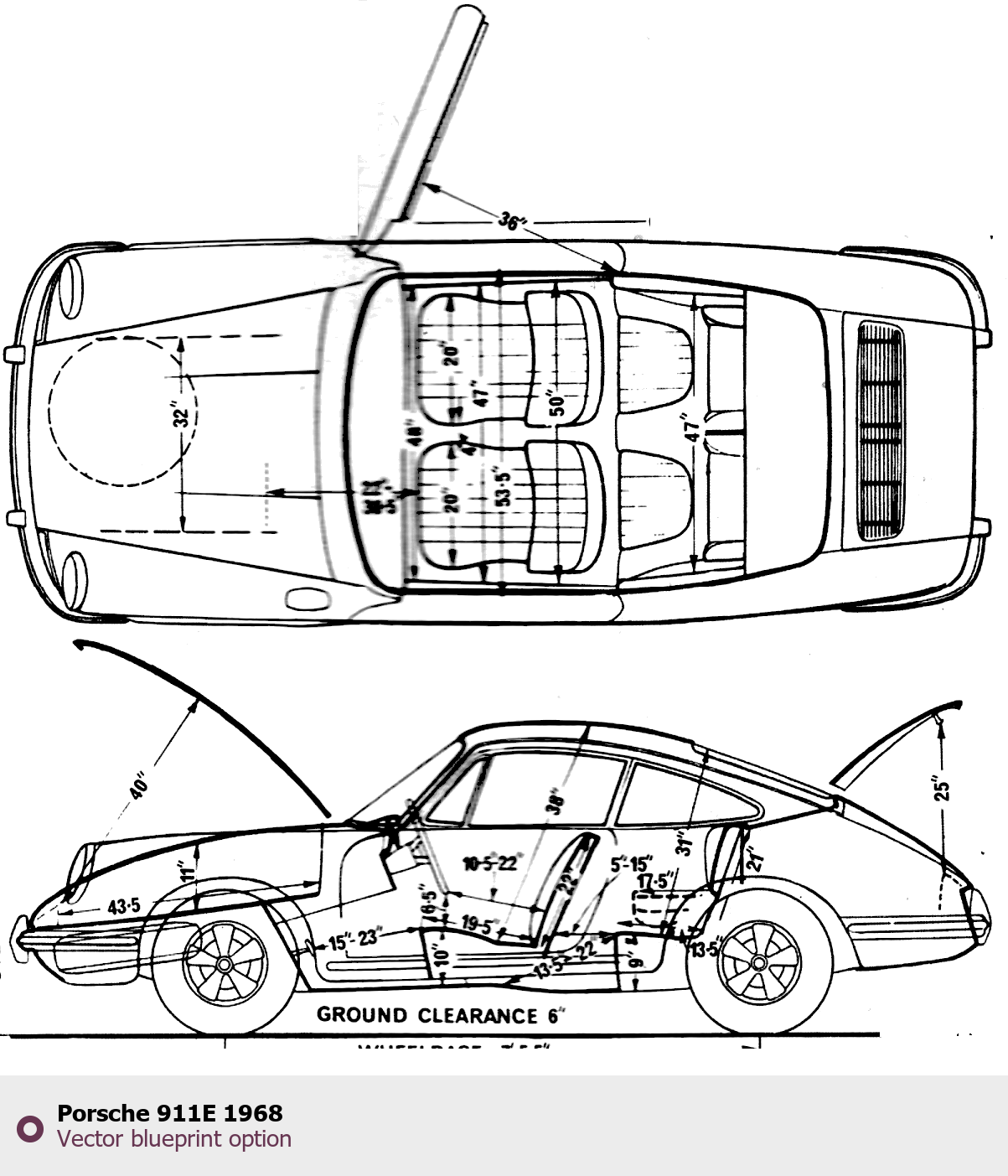 Raster blueprint of the 1968 Porsche 911E Tag. This free downloadable image can be used for graphic projects, digital design, and 3D modeling. The file provides accurate exterior proportions of the vehicle. Model year: 1968. Body type: Tag.