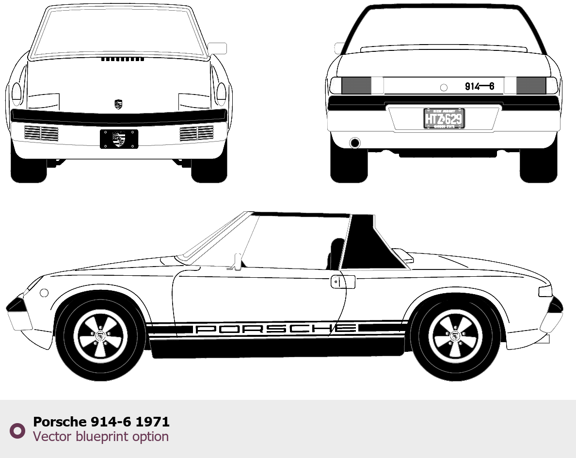 Raster blueprint of the 1971 Porsche 914-6 Tag. This free downloadable image can be used for graphic projects, digital design, and 3D modeling. The file provides accurate exterior proportions of the vehicle. Model year: 1971. Body type: Tag.