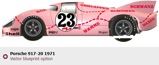 Raster blueprint of the 1971 Porsche 917-20 Tag. This free downloadable image can be used for graphic projects, digital design, and 3D modeling. The file provides accurate exterior proportions of the vehicle. Model year: 1971. Body type: Tag.