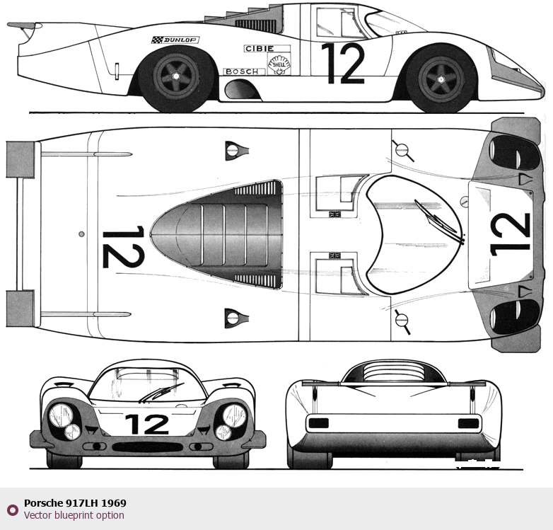 Raster blueprint of the 1969 Porsche 917LH Tag. This free downloadable image can be used for graphic projects, digital design, and 3D modeling. The file provides accurate exterior proportions of the vehicle. Model year: 1969. Body type: Tag.