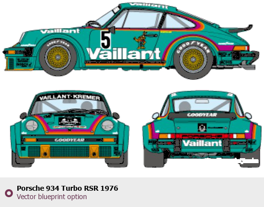 Raster blueprint of the 1976 Porsche 934 Turbo RSR Tag. This free downloadable image can be used for graphic projects, digital design, and 3D modeling. The file provides accurate exterior proportions of the vehicle. Model year: 1976. Body type: Tag.