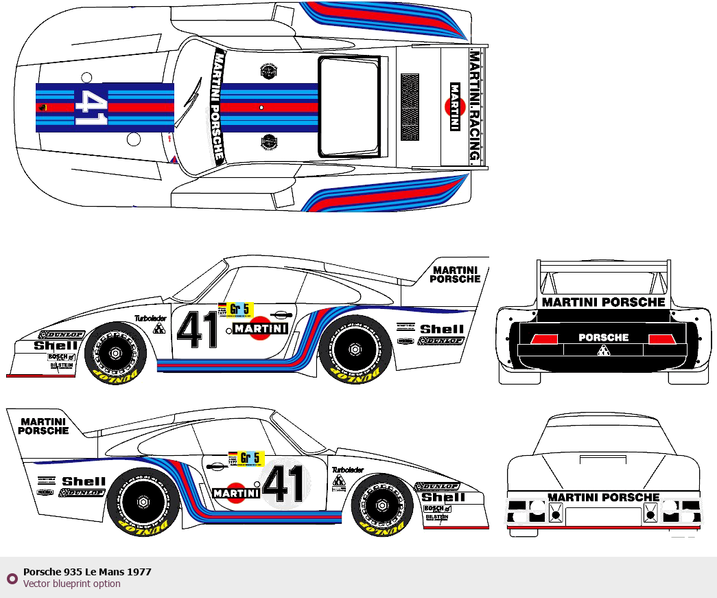 Raster blueprint of the 1977 Porsche 935 Le Mans Tag. This free downloadable image can be used for graphic projects, digital design, and 3D modeling. The file provides accurate exterior proportions of the vehicle. Model year: 1977. Body type: Tag.