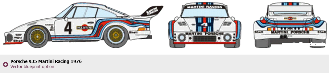 Raster blueprint of the 1976 Porsche 935 Martini Racing Tag. This free downloadable image can be used for graphic projects, digital design, and 3D modeling. The file provides accurate exterior proportions of the vehicle. Model year: 1976. Body type: Tag.