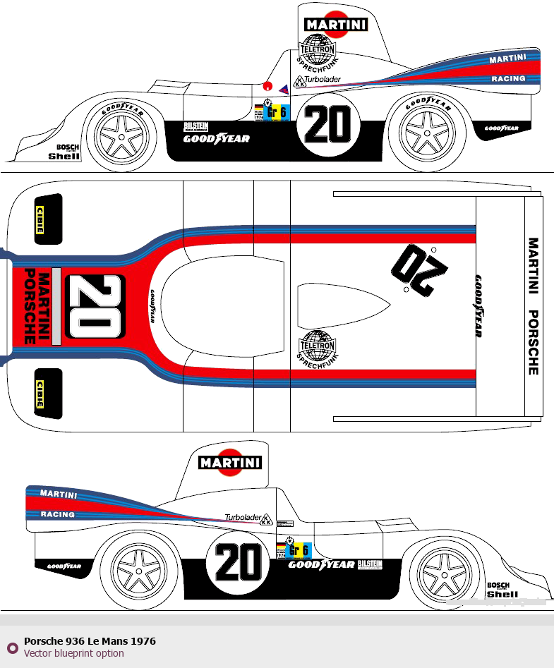 Raster blueprint of the 1976 Porsche 936 Le Mans Tag. This free downloadable image can be used for graphic projects, digital design, and 3D modeling. The file provides accurate exterior proportions of the vehicle. Model year: 1976. Body type: Tag.