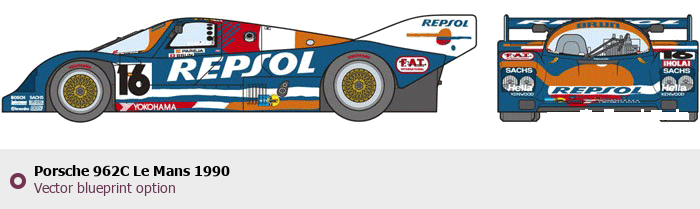 Raster blueprint of the 1990 Porsche 962C Le Mans Tag. This free downloadable image can be used for graphic projects, digital design, and 3D modeling. The file provides accurate exterior proportions of the vehicle. Model year: 1990. Body type: Tag.