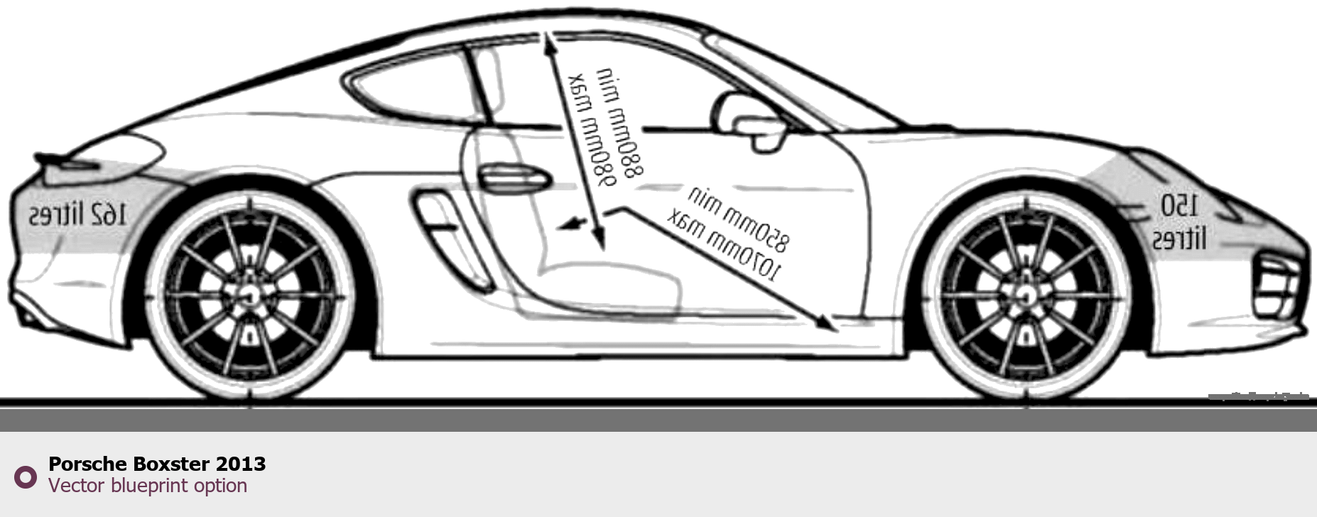 Raster blueprint of the 2013 Porsche Boxster Tag. This free downloadable image can be used for graphic projects, digital design, and 3D modeling. The file provides accurate exterior proportions of the vehicle. Model year: 2013. Body type: Tag.