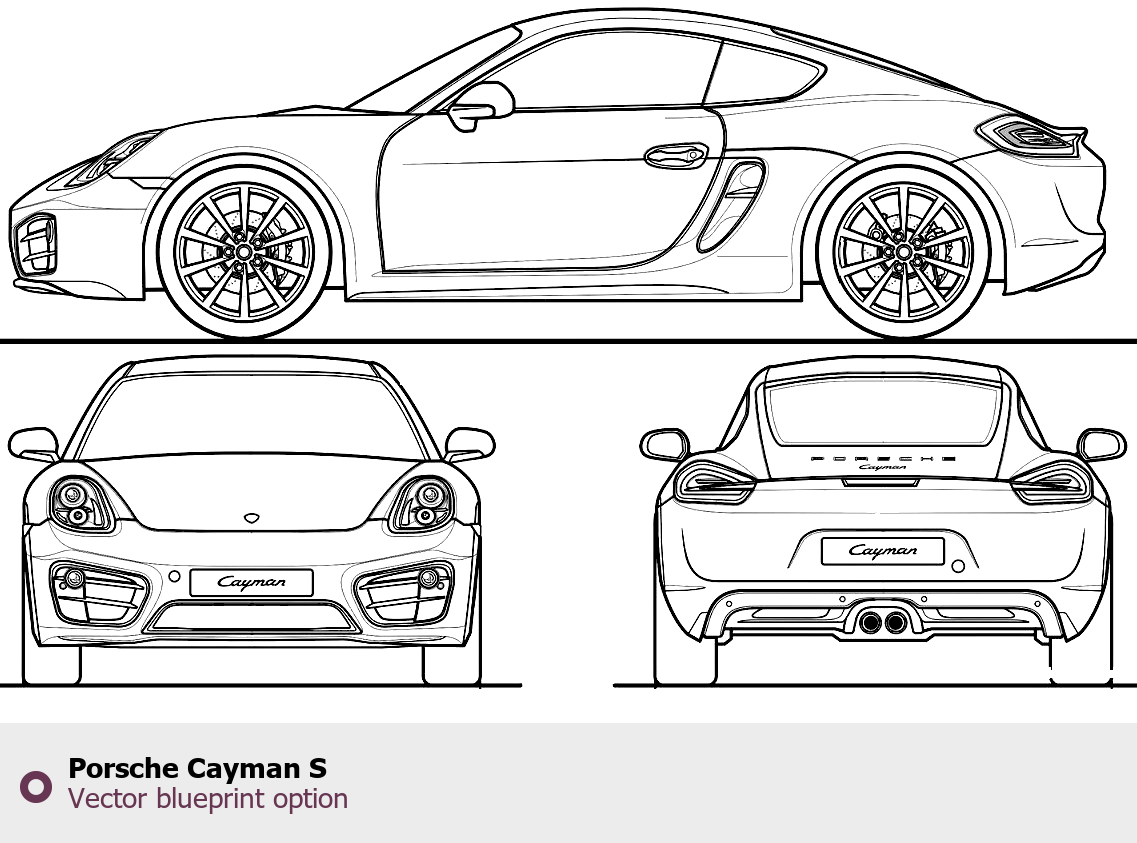 Raster blueprint of the Porsche Cayman S Coupe. This free downloadable image can be used for graphic projects, digital design, and 3D modeling. The file provides accurate exterior proportions of the vehicle. Body type: Coupe.