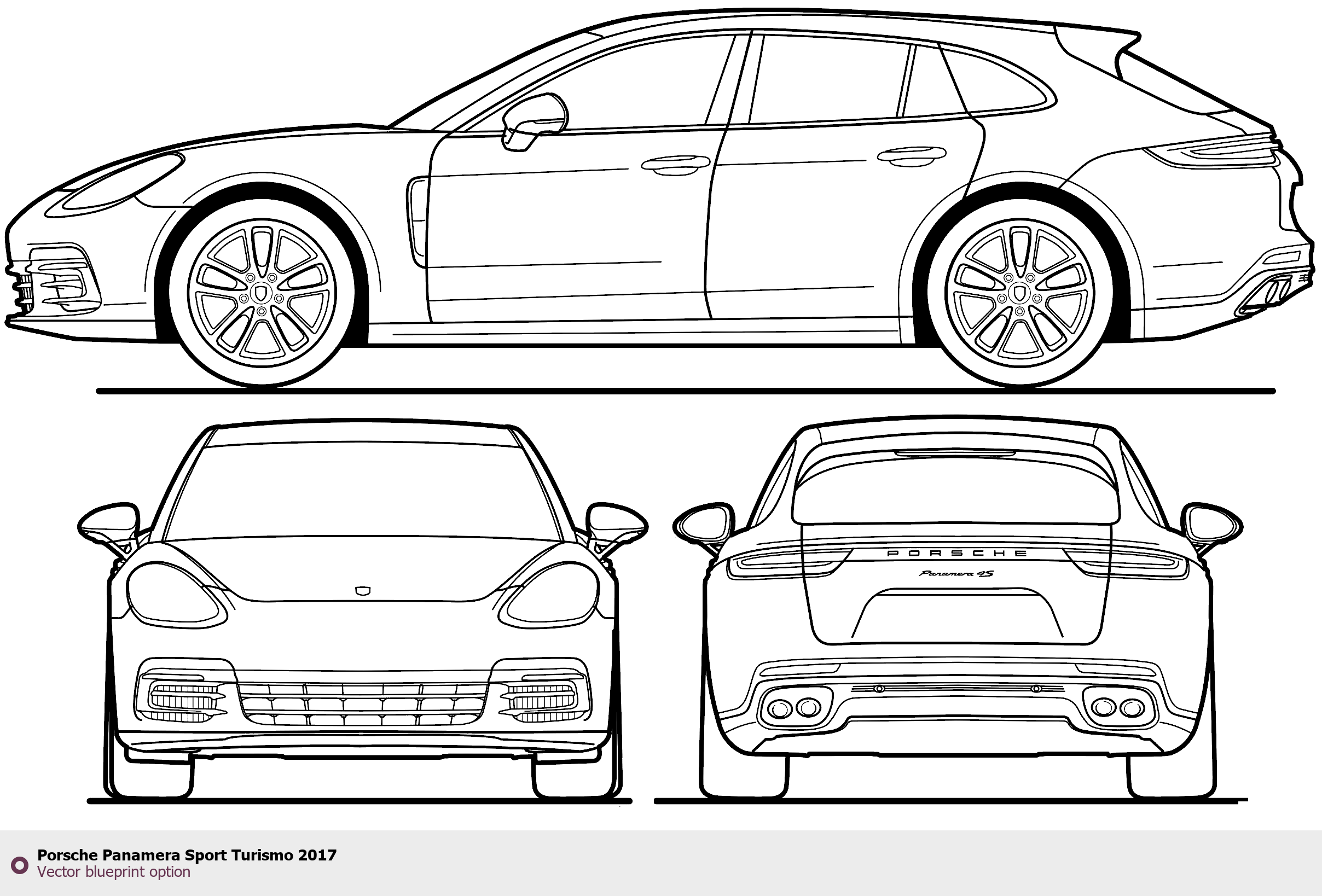 Raster blueprint of the 2017 Porsche Panamera Sport Turismo Sedan. This free downloadable image can be used for graphic projects, digital design, and 3D modeling. The file provides accurate exterior proportions of the vehicle. Model year: 2017. Body type: Sedan.