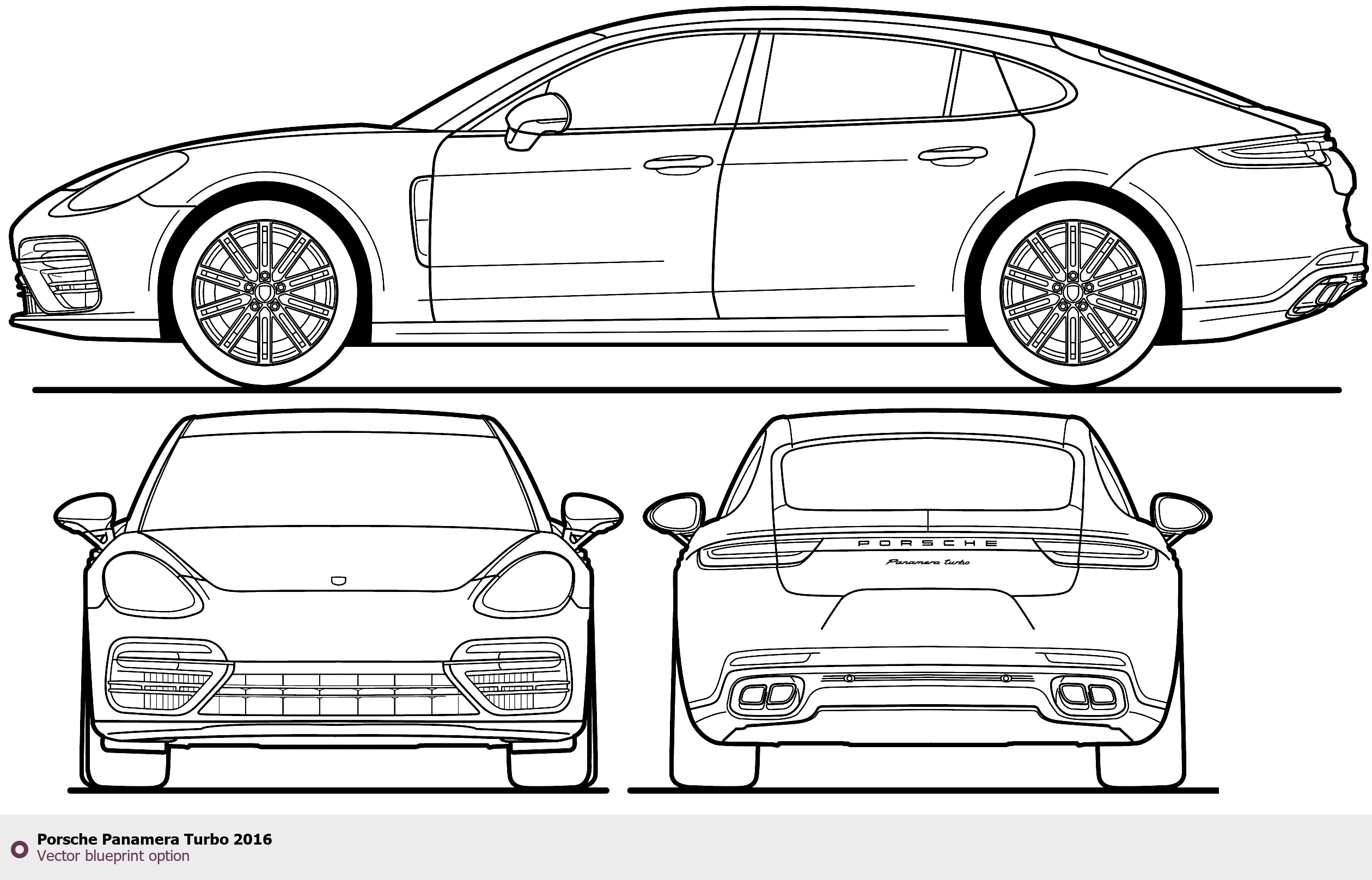 Raster blueprint of the 2016 Porsche Panamera Turbo Sedan. This free downloadable image can be used for graphic projects, digital design, and 3D modeling. The file provides accurate exterior proportions of the vehicle. Model year: 2016. Body type: Sedan.