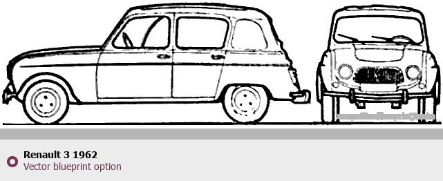 Raster blueprint of the 1962 Renault 3 Sedan. This free downloadable image can be used for graphic projects, digital design, and 3D modeling. The file provides accurate exterior proportions of the vehicle. Model year: 1962. Body type: Sedan.