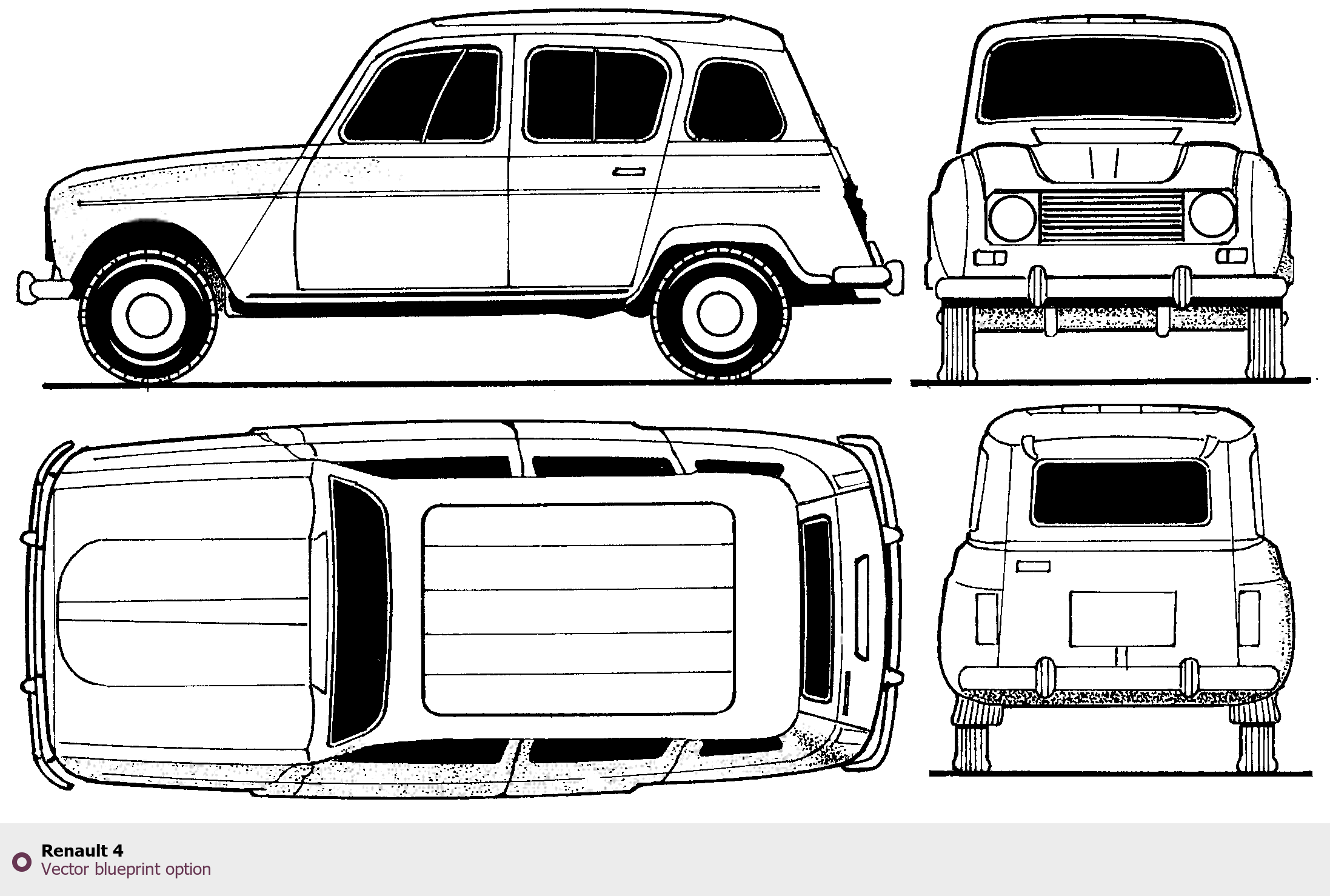 Raster blueprint of the Renault 4 Tag. This free downloadable image can be used for graphic projects, digital design, and 3D modeling. The file provides accurate exterior proportions of the vehicle. Body type: Tag.