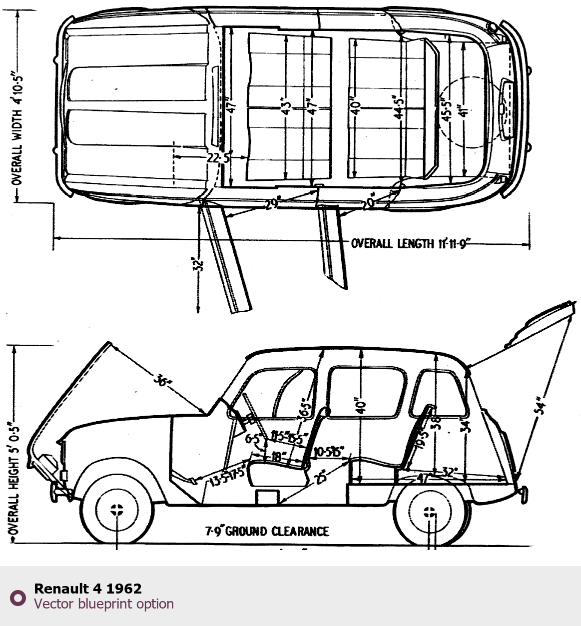 Raster blueprint of the 1962 Renault 4 Sedan. This free downloadable image can be used for graphic projects, digital design, and 3D modeling. The file provides accurate exterior proportions of the vehicle. Model year: 1962. Body type: Sedan.