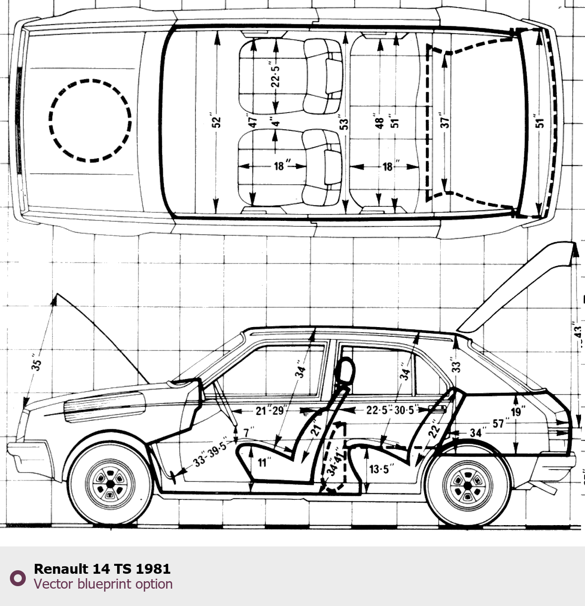 Raster blueprint of the 1981 Renault 14 TS Sedan. This free downloadable image can be used for graphic projects, digital design, and 3D modeling. The file provides accurate exterior proportions of the vehicle. Model year: 1981. Body type: Sedan.