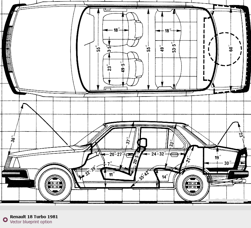 Raster blueprint of the 1981 Renault 18 Turbo Sedan. This free downloadable image can be used for graphic projects, digital design, and 3D modeling. The file provides accurate exterior proportions of the vehicle. Model year: 1981. Body type: Sedan.