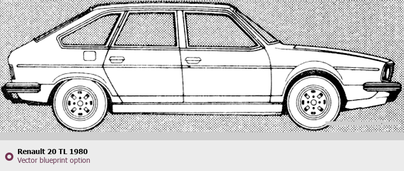 Raster blueprint of the 1980 Renault 20 TL Sedan. This free downloadable image can be used for graphic projects, digital design, and 3D modeling. The file provides accurate exterior proportions of the vehicle. Model year: 1980. Body type: Sedan.