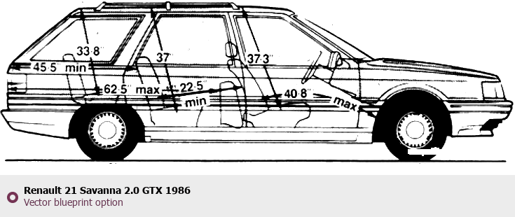Raster blueprint of the 1986 Renault 21 Savanna 2.0 GTX Sedan. This free downloadable image can be used for graphic projects, digital design, and 3D modeling. The file provides accurate exterior proportions of the vehicle. Model year: 1986. Body type: Sedan.