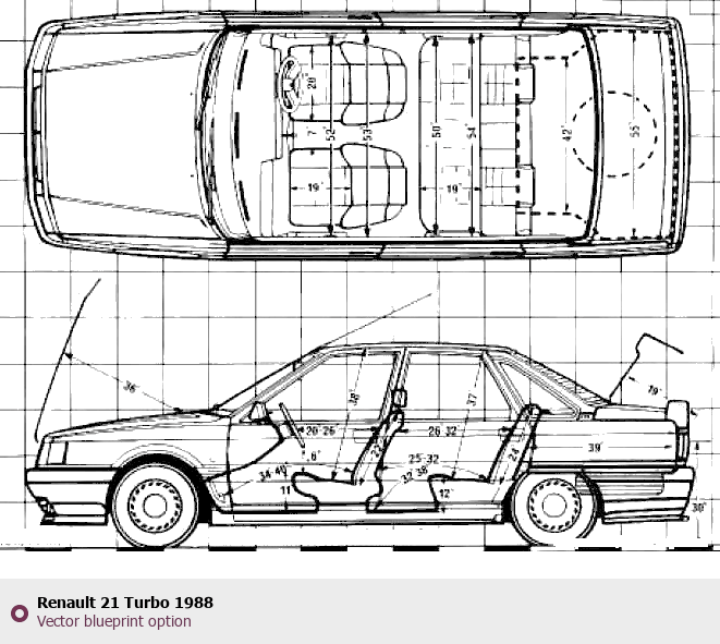 Raster blueprint of the 1988 Renault 21 Turbo Sedan. This free downloadable image can be used for graphic projects, digital design, and 3D modeling. The file provides accurate exterior proportions of the vehicle. Model year: 1988. Body type: Sedan.
