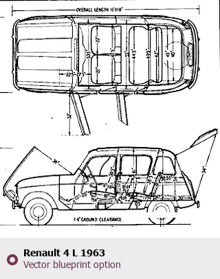 Raster blueprint of the 1963 Renault 4 L Sedan. This free downloadable image can be used for graphic projects, digital design, and 3D modeling. The file provides accurate exterior proportions of the vehicle. Model year: 1963. Body type: Sedan.