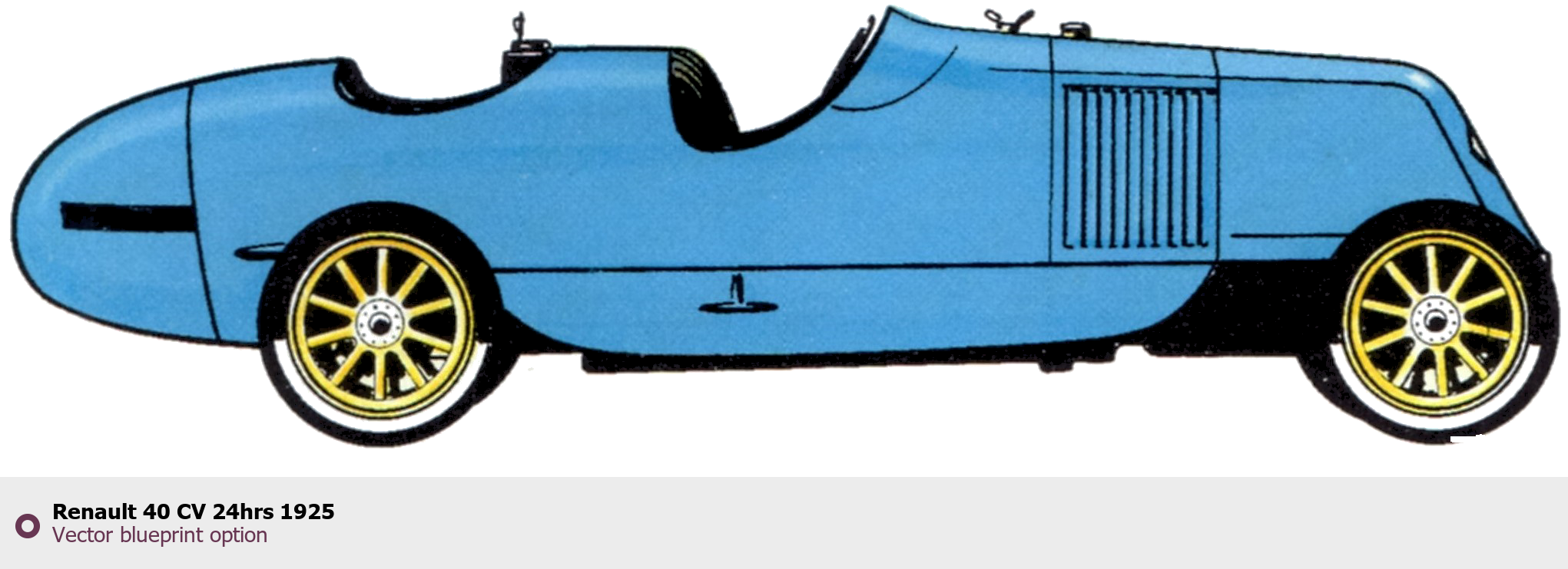 Raster blueprint of the 1925 Renault 40 CV 24hrs Sedan. This free downloadable image can be used for graphic projects, digital design, and 3D modeling. The file provides accurate exterior proportions of the vehicle. Model year: 1925. Body type: Sedan.