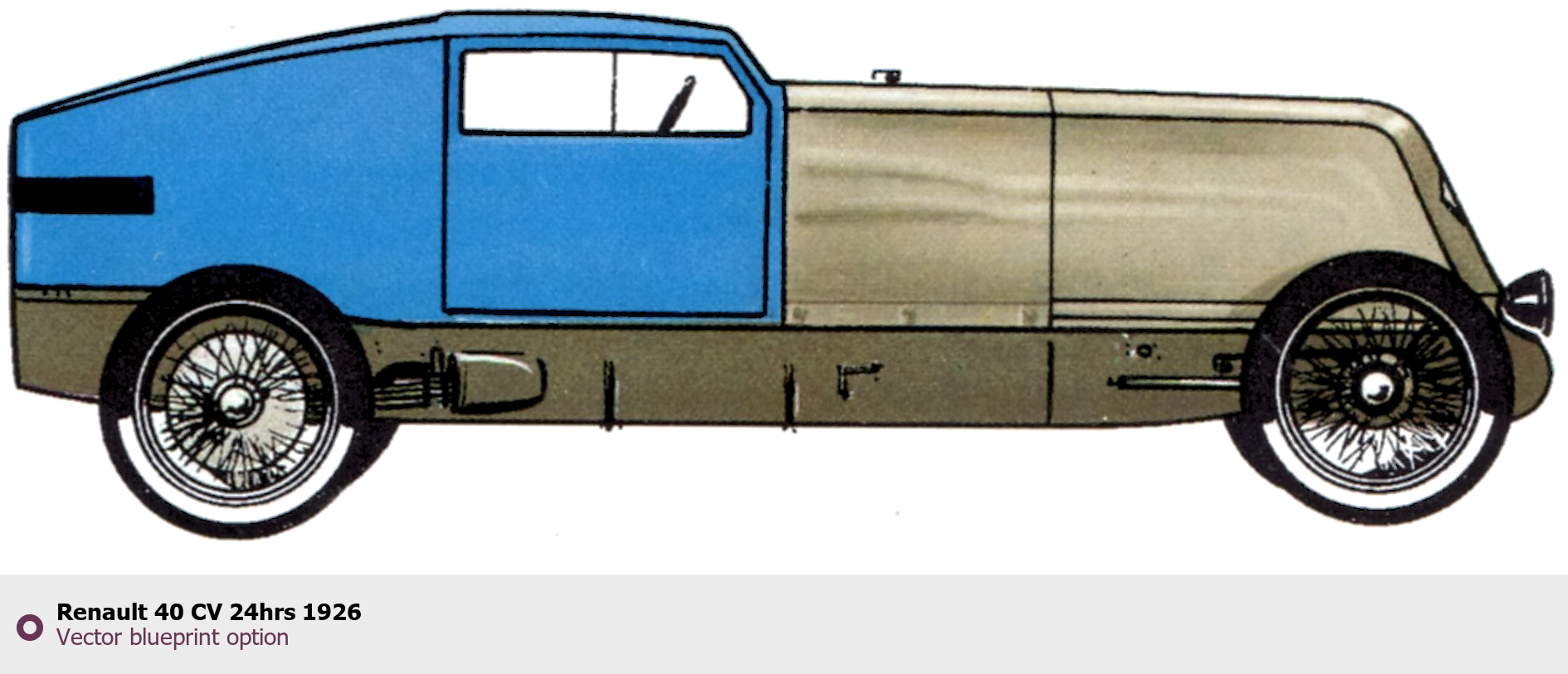 Raster blueprint of the 1926 Renault 40 CV 24hrs Sedan. This free downloadable image can be used for graphic projects, digital design, and 3D modeling. The file provides accurate exterior proportions of the vehicle. Model year: 1926. Body type: Sedan.