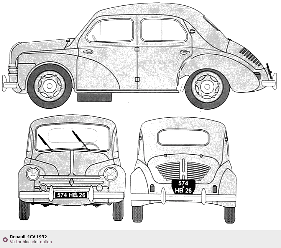 Raster blueprint of the 1952 Renault 4CV Sedan. This free downloadable image can be used for graphic projects, digital design, and 3D modeling. The file provides accurate exterior proportions of the vehicle. Model year: 1952. Body type: Sedan.