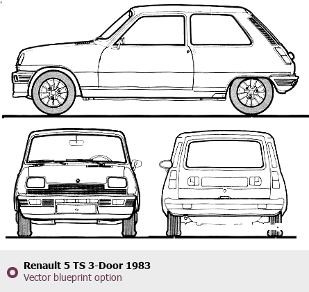 Raster blueprint of the 1983 Renault 5 TS 3-Door Hatchback. This free downloadable image can be used for graphic projects, digital design, and 3D modeling. The file provides accurate exterior proportions of the vehicle. Model year: 1983. Body type: Hatchback.