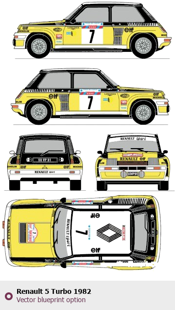 Raster blueprint of the 1982 Renault 5 Turbo Hatchback. This free downloadable image can be used for graphic projects, digital design, and 3D modeling. The file provides accurate exterior proportions of the vehicle. Model year: 1982. Body type: Hatchback.
