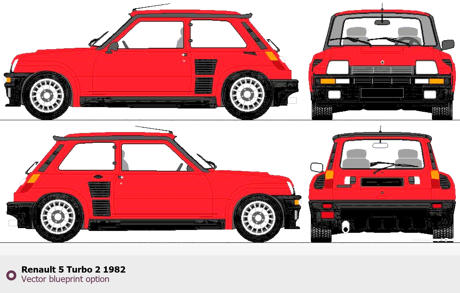 Raster blueprint of the 1982 Renault 5 Turbo 2 Hatchback. This free downloadable image can be used for graphic projects, digital design, and 3D modeling. The file provides accurate exterior proportions of the vehicle. Model year: 1982. Body type: Hatchback.