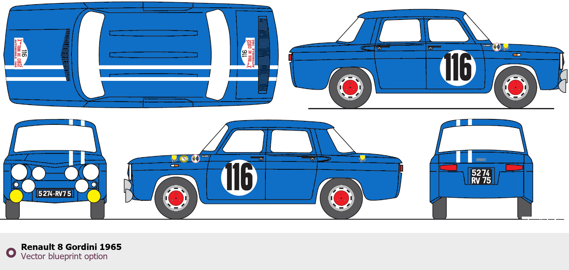 Raster blueprint of the 1965 Renault 8 Gordini Sedan. This free downloadable image can be used for graphic projects, digital design, and 3D modeling. The file provides accurate exterior proportions of the vehicle. Model year: 1965. Body type: Sedan.