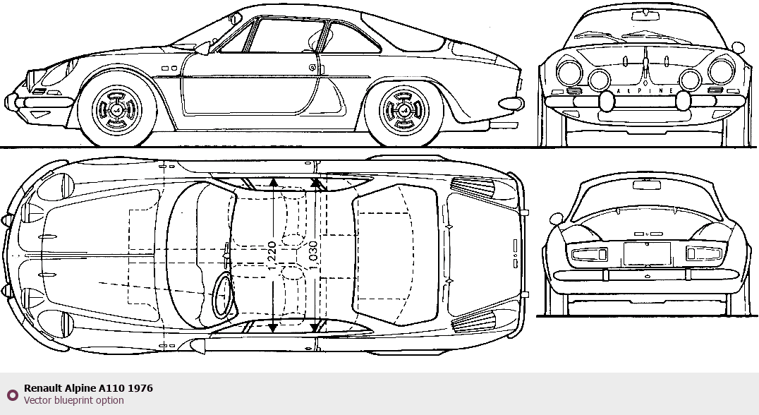 Raster blueprint of the 1976 Renault Alpine A110 Coupe. This free downloadable image can be used for graphic projects, digital design, and 3D modeling. The file provides accurate exterior proportions of the vehicle. Model year: 1976. Body type: Coupe.