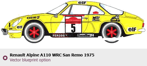 Raster blueprint of the 1975 Renault Alpine A110 WRC San Remo Coupe. This free downloadable image can be used for graphic projects, digital design, and 3D modeling. The file provides accurate exterior proportions of the vehicle. Model year: 1975. Body type: Coupe.