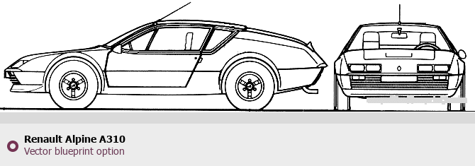 Raster blueprint of the Renault Alpine A310 Tag. This free downloadable image can be used for graphic projects, digital design, and 3D modeling. The file provides accurate exterior proportions of the vehicle. Body type: Tag.