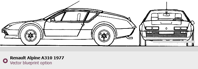 Raster blueprint of the 1977 Renault Alpine A310 Sedan. This free downloadable image can be used for graphic projects, digital design, and 3D modeling. The file provides accurate exterior proportions of the vehicle. Model year: 1977. Body type: Sedan.
