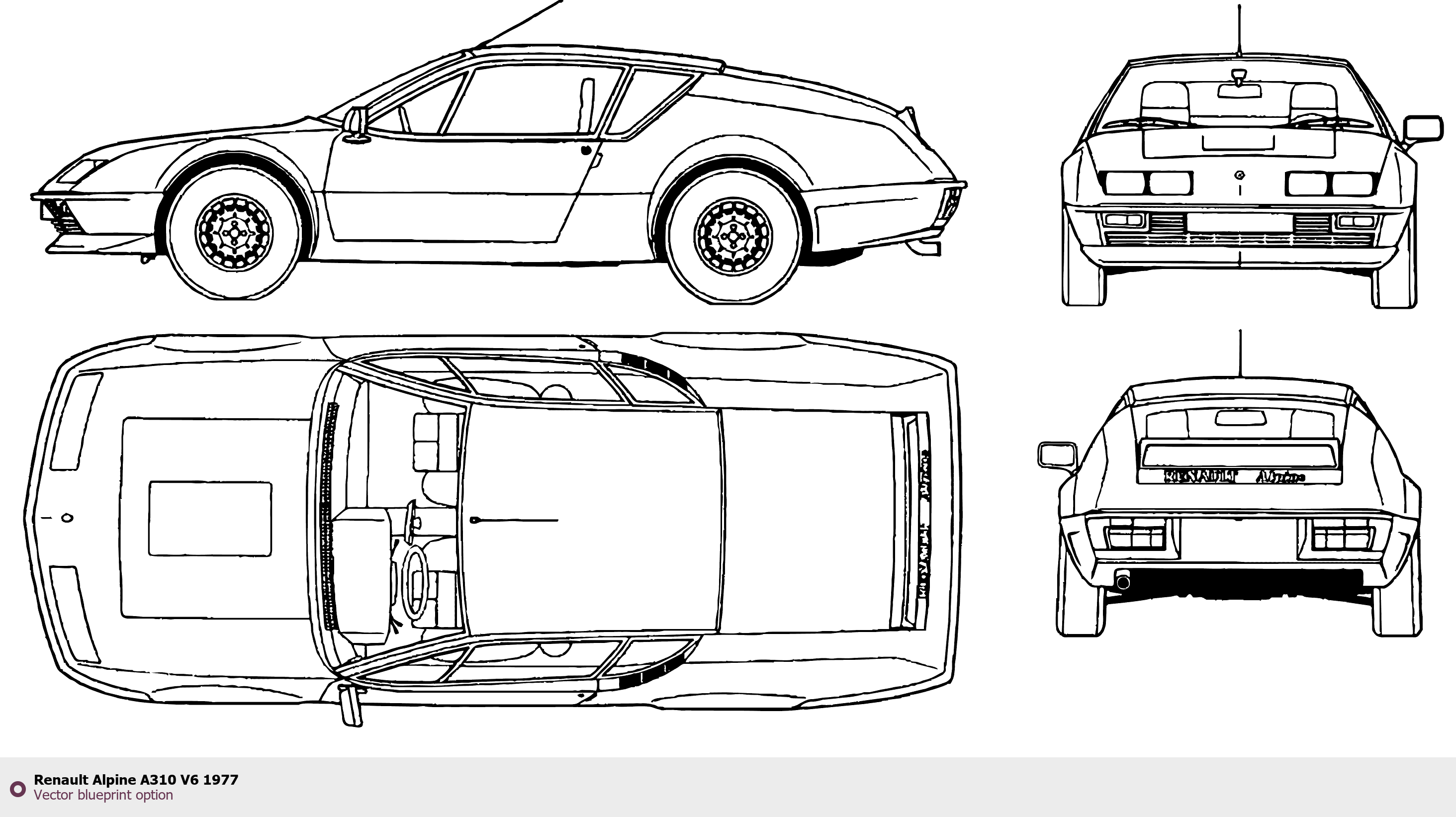 Raster blueprint of the 1977 Renault Alpine A310 V6 Sedan. This free downloadable image can be used for graphic projects, digital design, and 3D modeling. The file provides accurate exterior proportions of the vehicle. Model year: 1977. Body type: Sedan.