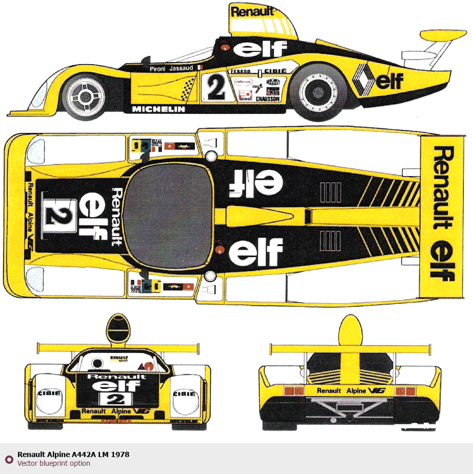 Raster blueprint of the 1978 Renault Alpine A442A LM Sedan. This free downloadable image can be used for graphic projects, digital design, and 3D modeling. The file provides accurate exterior proportions of the vehicle. Model year: 1978. Body type: Sedan.