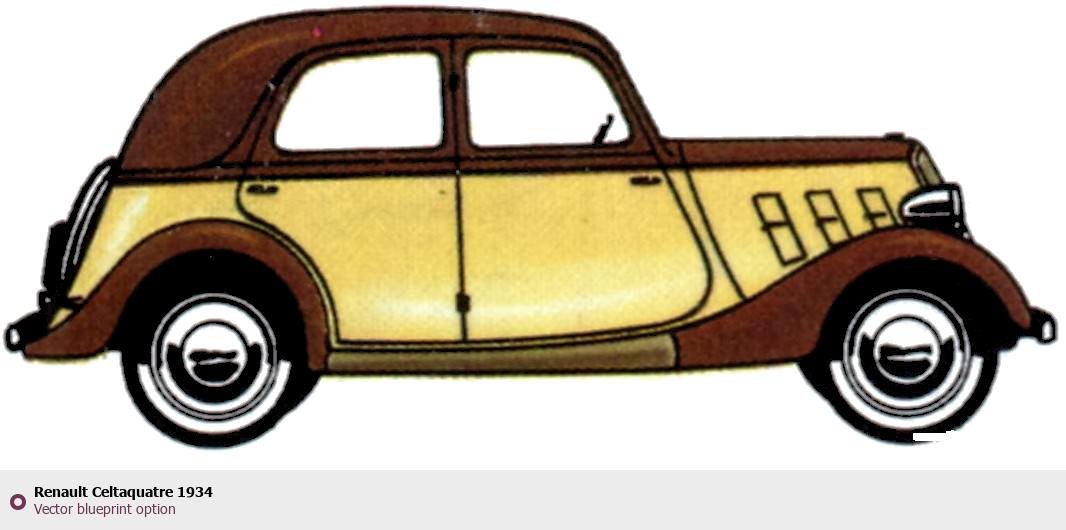 Raster blueprint of the 1934 Renault Celtaquatre Sedan. This free downloadable image can be used for graphic projects, digital design, and 3D modeling. The file provides accurate exterior proportions of the vehicle. Model year: 1934. Body type: Sedan.
