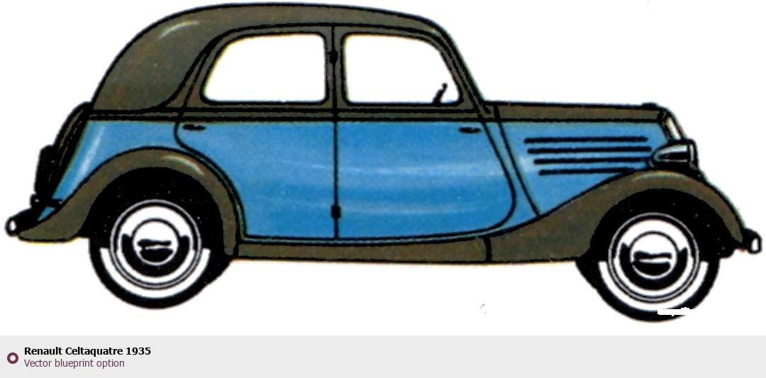 Raster blueprint of the 1935 Renault Celtaquatre Sedan. This free downloadable image can be used for graphic projects, digital design, and 3D modeling. The file provides accurate exterior proportions of the vehicle. Model year: 1935. Body type: Sedan.
