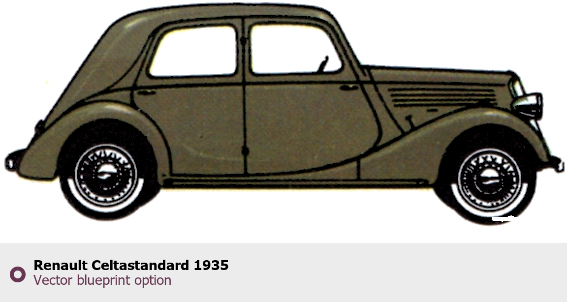 Raster blueprint of the 1935 Renault Celtastandard Sedan. This free downloadable image can be used for graphic projects, digital design, and 3D modeling. The file provides accurate exterior proportions of the vehicle. Model year: 1935. Body type: Sedan.
