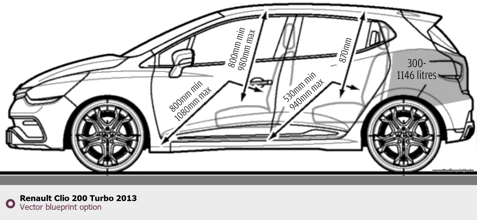 Raster blueprint of the 2013 Renault Clio 200 Turbo Hatchback. This free downloadable image can be used for graphic projects, digital design, and 3D modeling. The file provides accurate exterior proportions of the vehicle. Model year: 2013. Body type: Hatchback.