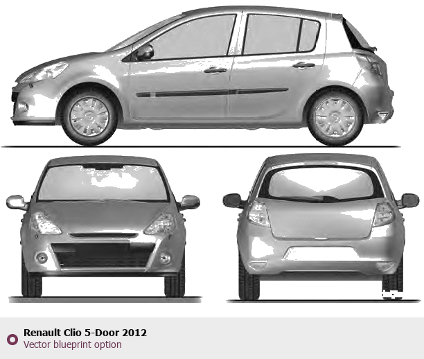 Raster blueprint of the 2012 Renault Clio 5-Door Hatchback. This free downloadable image can be used for graphic projects, digital design, and 3D modeling. The file provides accurate exterior proportions of the vehicle. Model year: 2012. Body type: Hatchback.